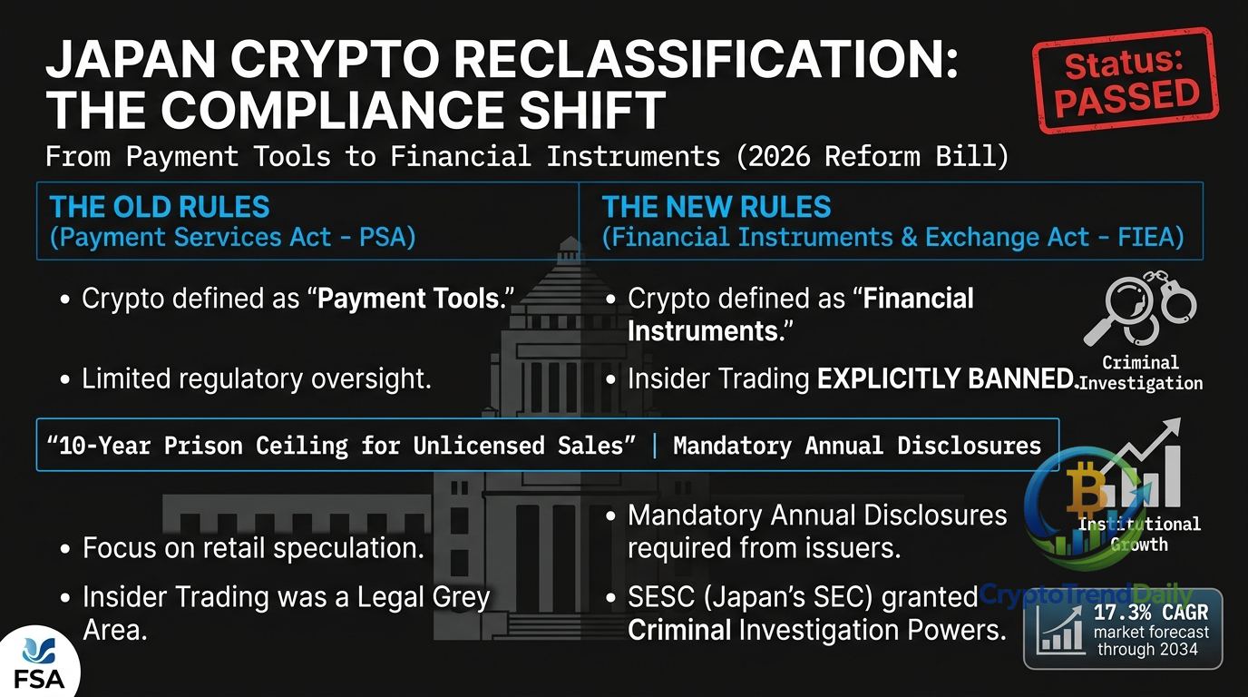On Friday, April 11, 2026, the Japanese government amended the Financial Instruments and Exchange Act, officially recognizing approximately 105 cryptocurrencies, including Bitcoin ($BTC) and Ethereum (ETH), as regulated financial products. This legislative pivot follows years of deliberation by the Financial Services Agency (FSA) and marks a shift from treating crypto as a "means of payment" to a "growth capital asset." The bill mandates that crypto issuers and exchanges provide annual disclosures and prohibits any trading based on non-public information—a standard that has long been absent in the digital asset space.